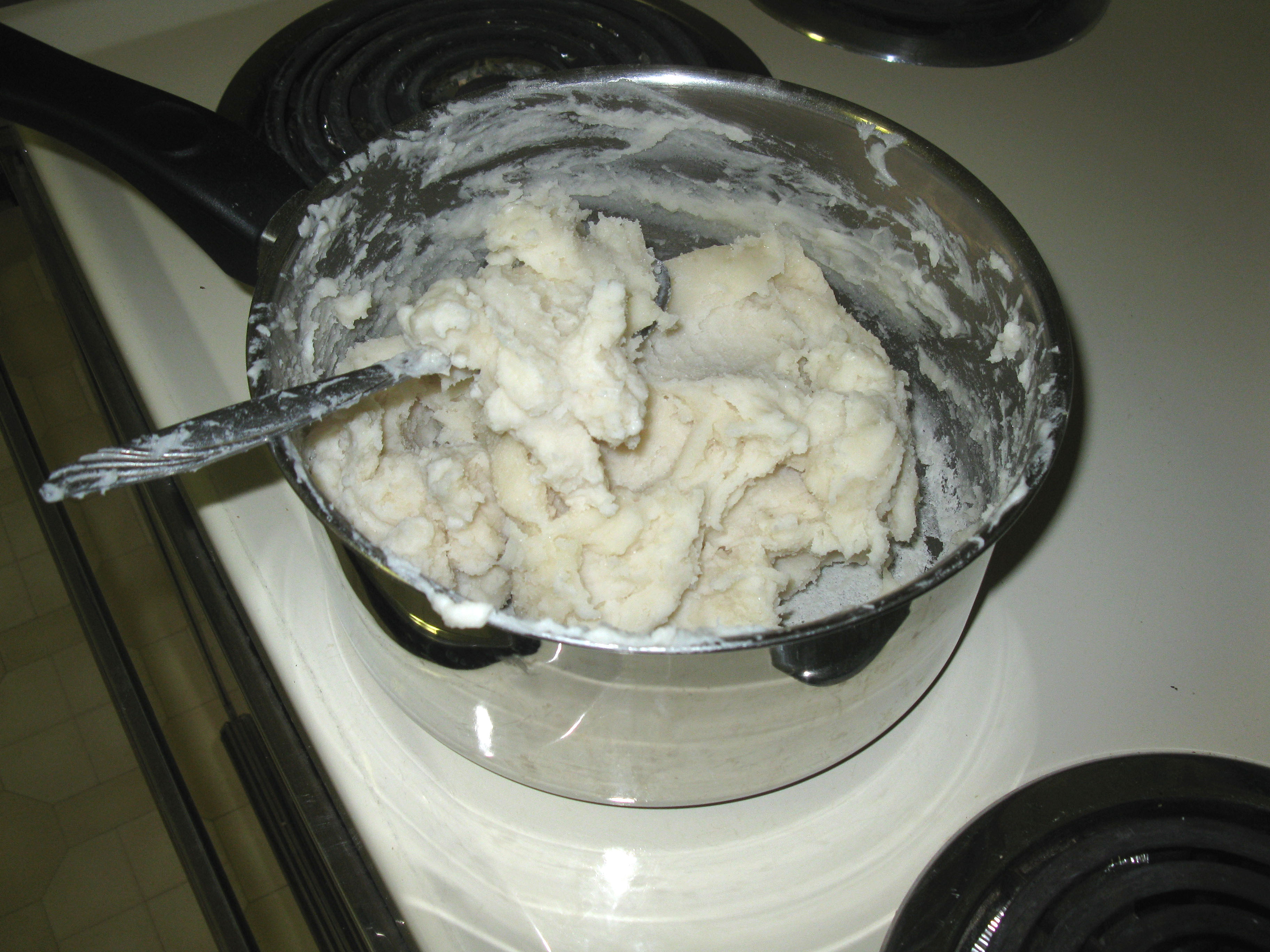 Cook over medium heat, stirring constantly, for 3 – 5 minutes. Dough will become difficult to stir and form a “clump.” Looks like mashed potatoes!