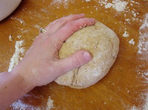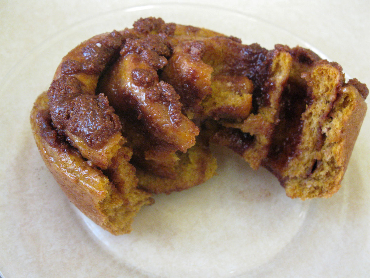 In a small mixing bowl, combine the flour, salt, cinnamon and pumpkin pie spice. Add the flour mixture 1 cup at a time to the rest of the ingredients, whisking in the first cup and stirring in the remaining two cups with a wooden spoon. Knead the dough in the bowl about ten times to incorporate the flour and form a nice ball of dough. Leave the dough in the bowl, cover with a dish towel and let it rise in a warm place for 45 minutes.