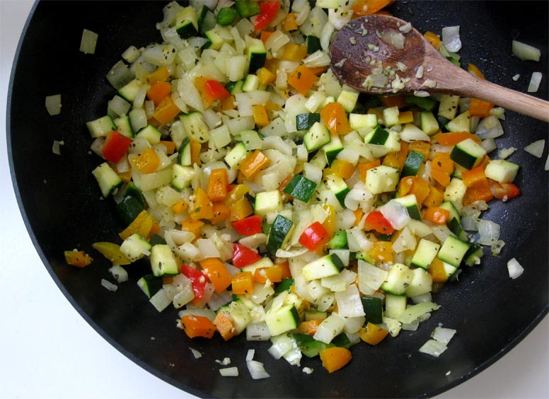 Heat the sunflower oil in a large skillet on medium heat. Add the diced onion and crushed garlic and saute 3-5 minutes. Add the diced zucchini and diced peppers to the onion and garlic along with the Italian seasoning. Cook 10-12 minutes, until the vegetables become soft.