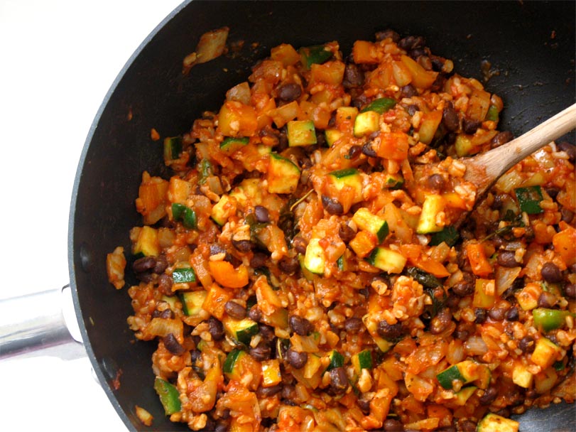 Stir in the pasta sauce, cooked brown rice and black beans. Cook 5 -10 minutes more, until the entire mixture is hot. Remove the mixture from the heat and set aside while you prepare the peppers.