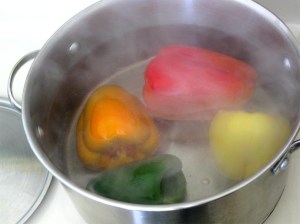 Blanch the peppers in the boiling water for a few minutes, watching them carefully. You do not want them to get too soft or they will not stand.