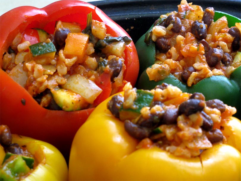 Preheat the oven to 350°F. Stand the blanched peppers up in a baking dish and stuff them with the Italian bean/rice mixture.