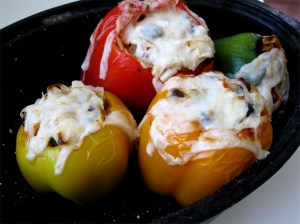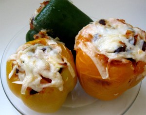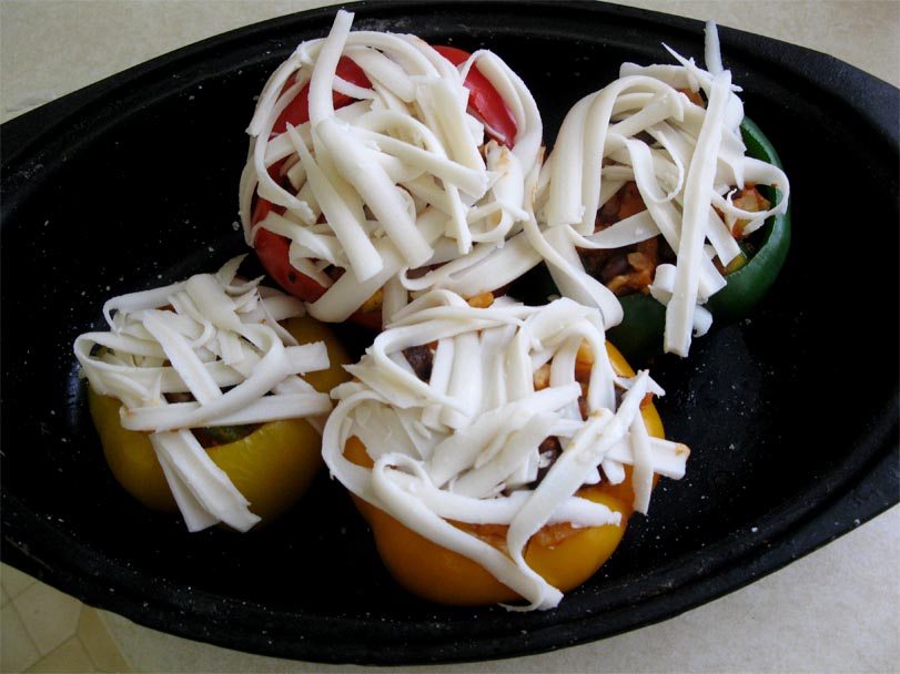Top with the grated soy mozzarella cheese and bake for 15 minutes. Broil the peppers for the last few minutes of the baking time to melt the cheese.