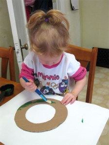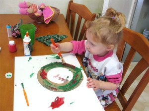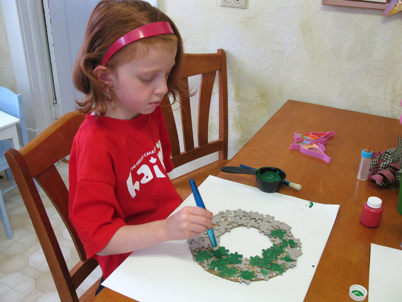 With there being only 18 more days until Christmas day, we decided that the house needed some more decorations to make it even more merry. The other day we were doing puzzles and realized that we had so many puzzles that were missing pieces. Instead of throwing them away, I thought that I could save them and use them for a craft. This morning I dug around in the recycling bin, got out some cardboard, paint, glitter and ribbon and we got busy making Puzzle Piece Christmas wreaths.