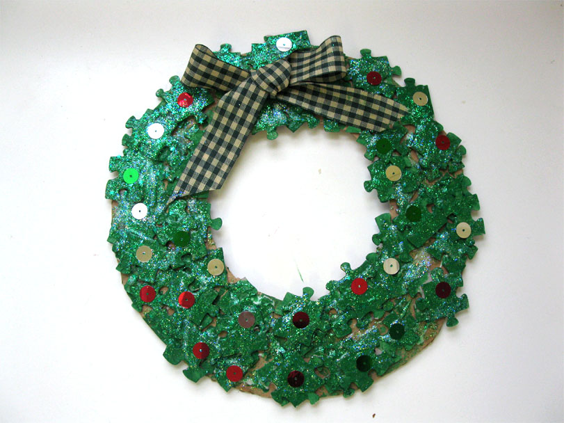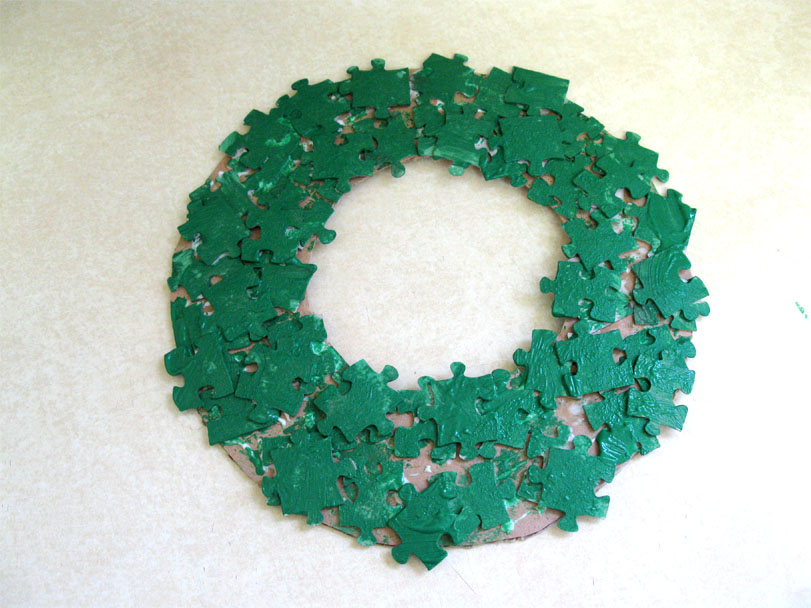 Next, glue the puzzle pieces onto the wreath however you want to.