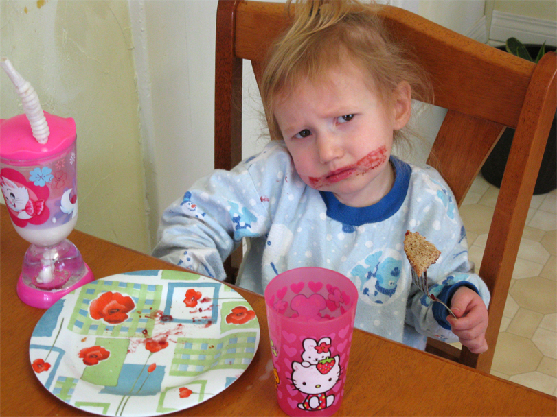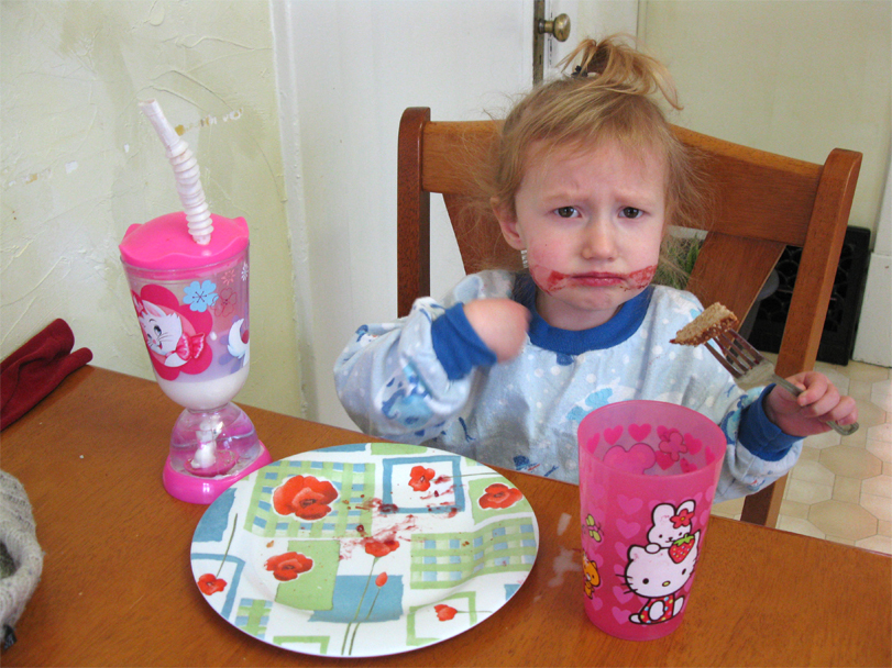 How could mom possibly forget that?! Child eats her toast with a fork as contentedly as can be expected, while mom decides to get the camera and take a picture to remember this moment forever.