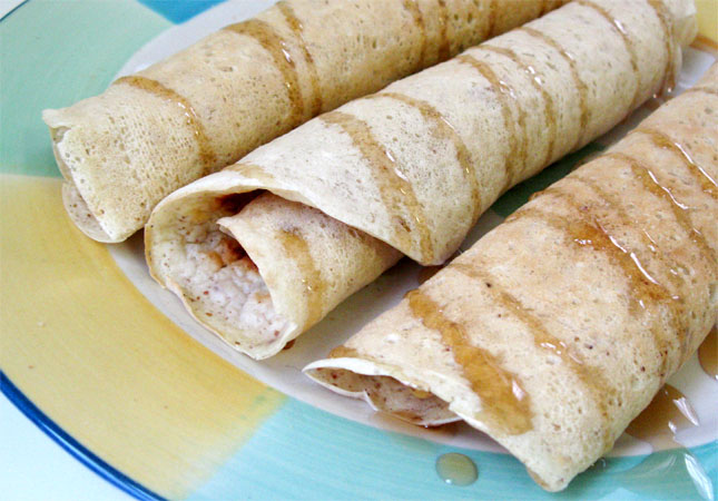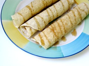 These crepes are made with whole wheat flour and ground flax seed to replace what would be an egg. Flax seeds are high in Omega 3 and fiber and have also been shown to help control and prevent high blood pressure. They are sure to keep you full right on until lunch. Serve with all-fruit jam or pure maple syrup.