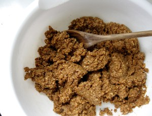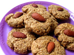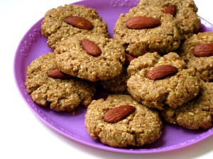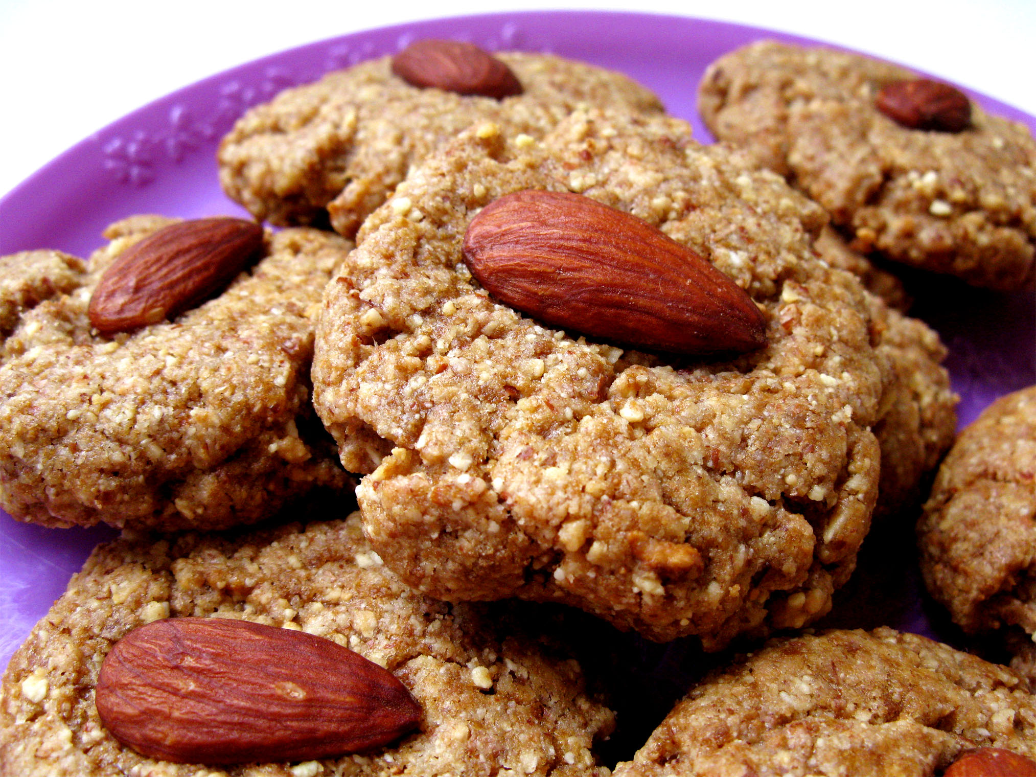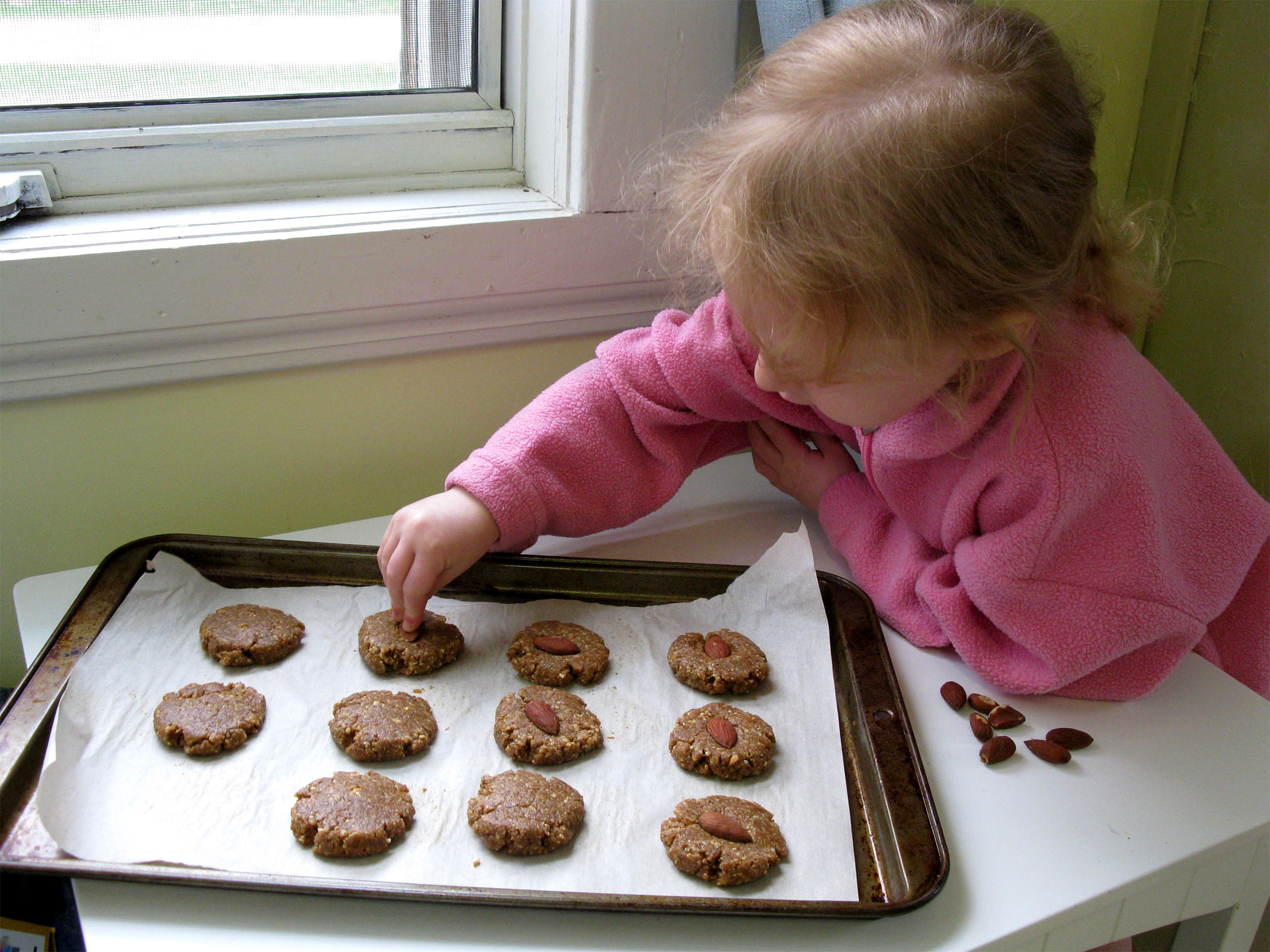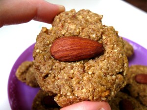 Roll the cookies into walnut-size balls and drop onto the baking sheet. Press the cookies down slightly with your hands then place a whole roasted almond into the center of each cookie. Bake for 8-10 minutes, until very lightly browned.