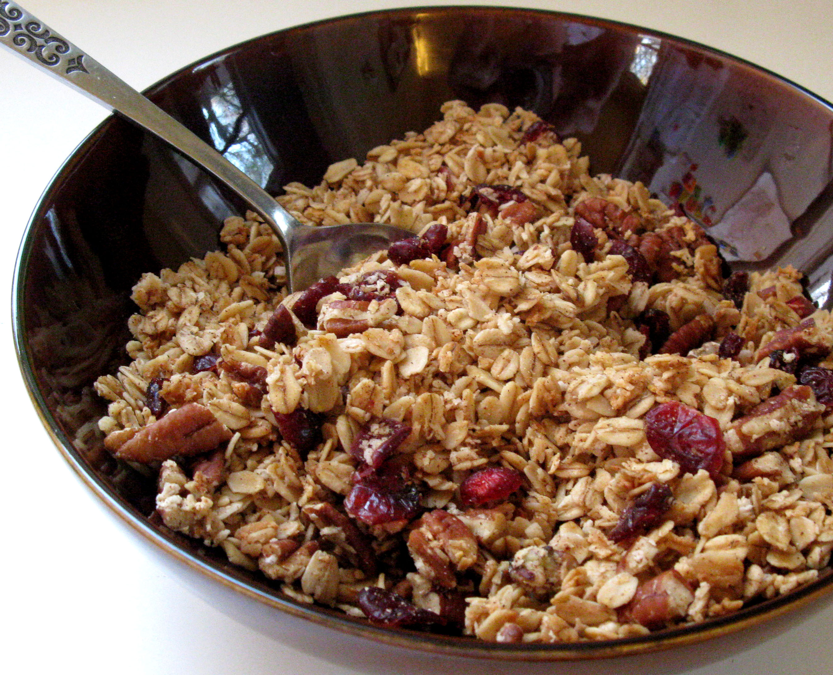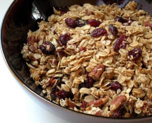 This sweet crunch granola is made with some of my favorite ingredients, maple syrup, dried cranberries, shredded coconut and pecans. A great snack anytime and a perfect way to start your day!