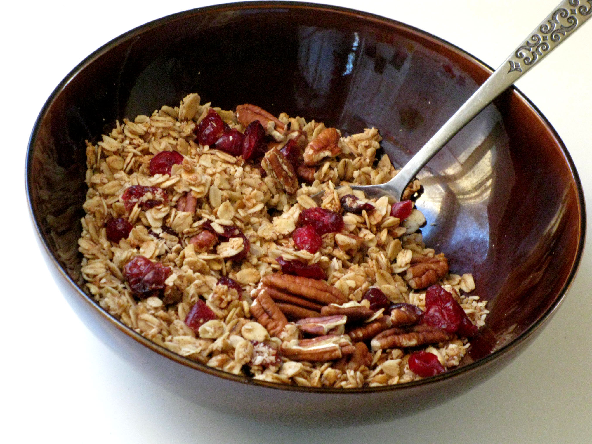 Directions Preheat oven to 350°F and line a baking sheet with parchment paper. In a large mixing bowl combine the oats, coconut, cranberries, pecans and cinnamon. Add the maple syrup and the sunflower oil and mix until combined. Transfer the granola to the baking sheet and spread evenly. Bake for 20-25 minutes, rearranging the granola halfway through baking time Allow to cool completely before removing from the pan. Store in an airtight container or mason jar.