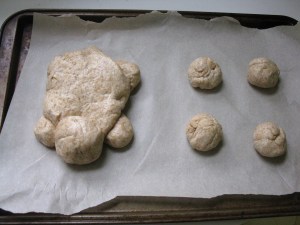 7. Divide one of the two sections of dough in half. Roll one of these halves into a round ball (this is the bears head) and shape the remaining dough into four equal balls for each of the bears limbs.