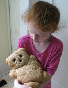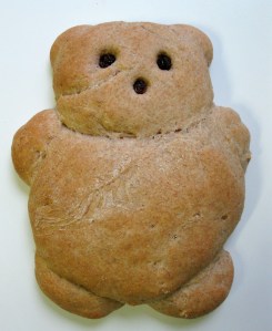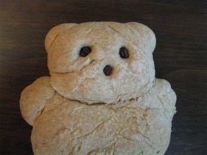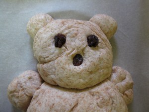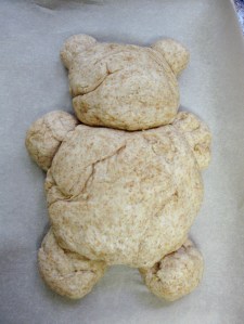 14. During the last 5 minutes of rising time, preheat the oven to 350F. Place the bear into the preheated oven to bake for 17 minutes or until golden.
