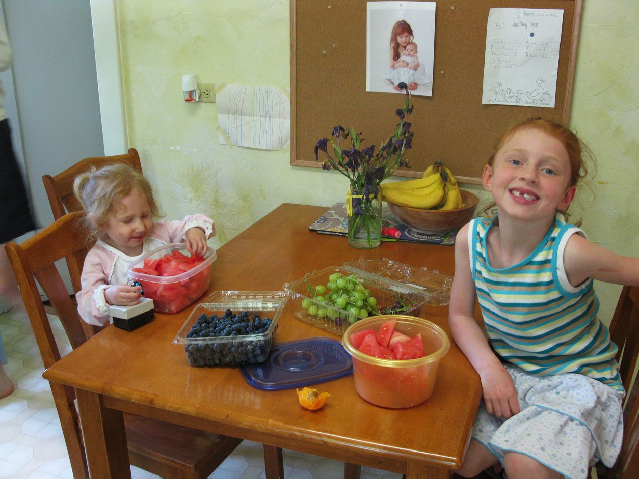 For our afternoon snack I cut up the first watermelon that we have purchased this year and we had a big snack of fruit. The girls love watermelon and beg for it every time that we go to the store and today was a perfect day for it. We had watermelon, grapes, blueberries and apricots.