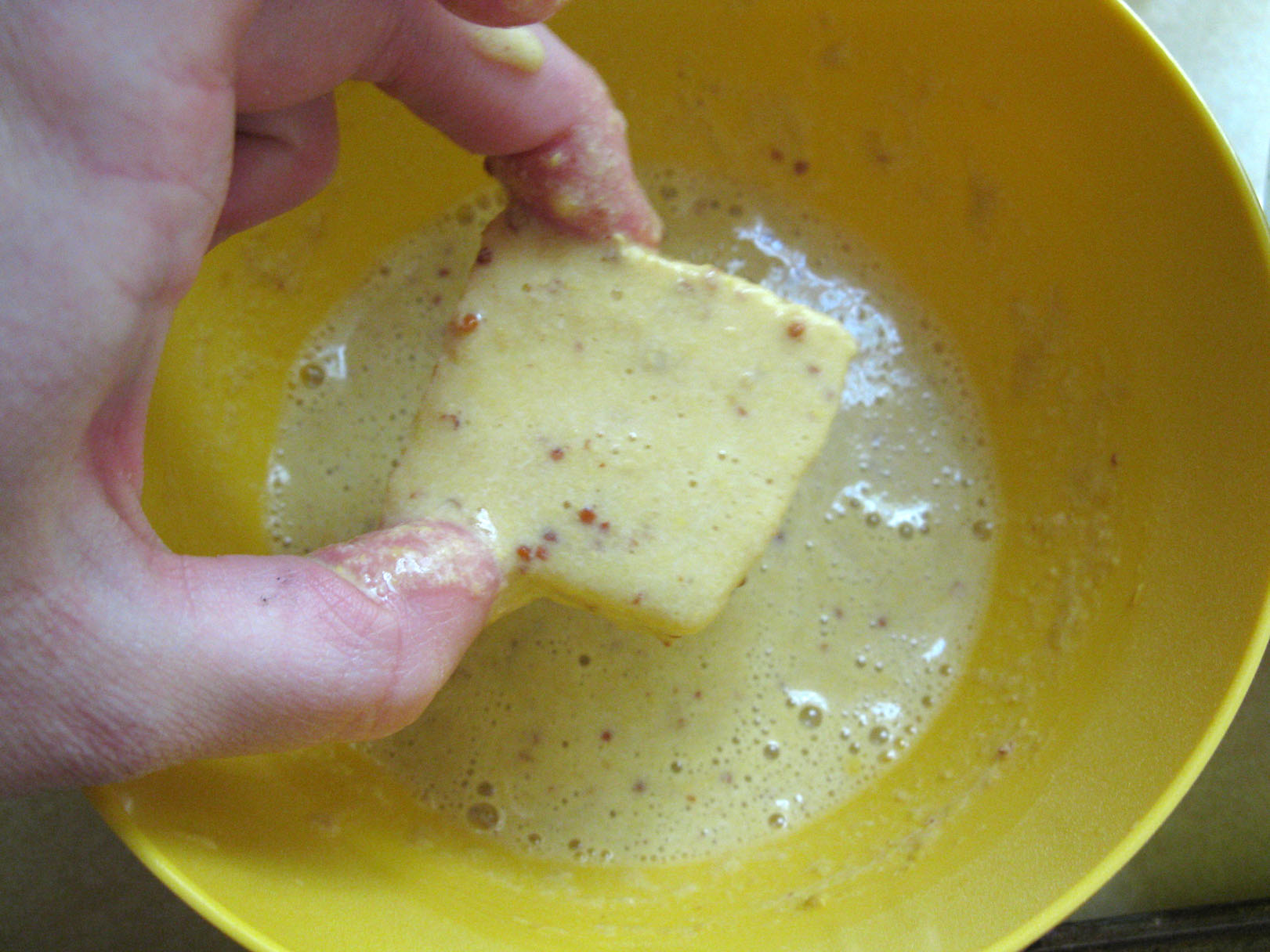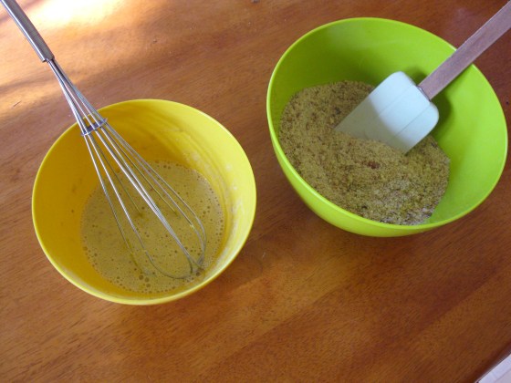 In a small bowl, whisk together the milk, Dijon and nutritional yeast. In another small bowl, combine the bread crumbs, onion flakes, garlic powder, sage, sea salt and pepper.
