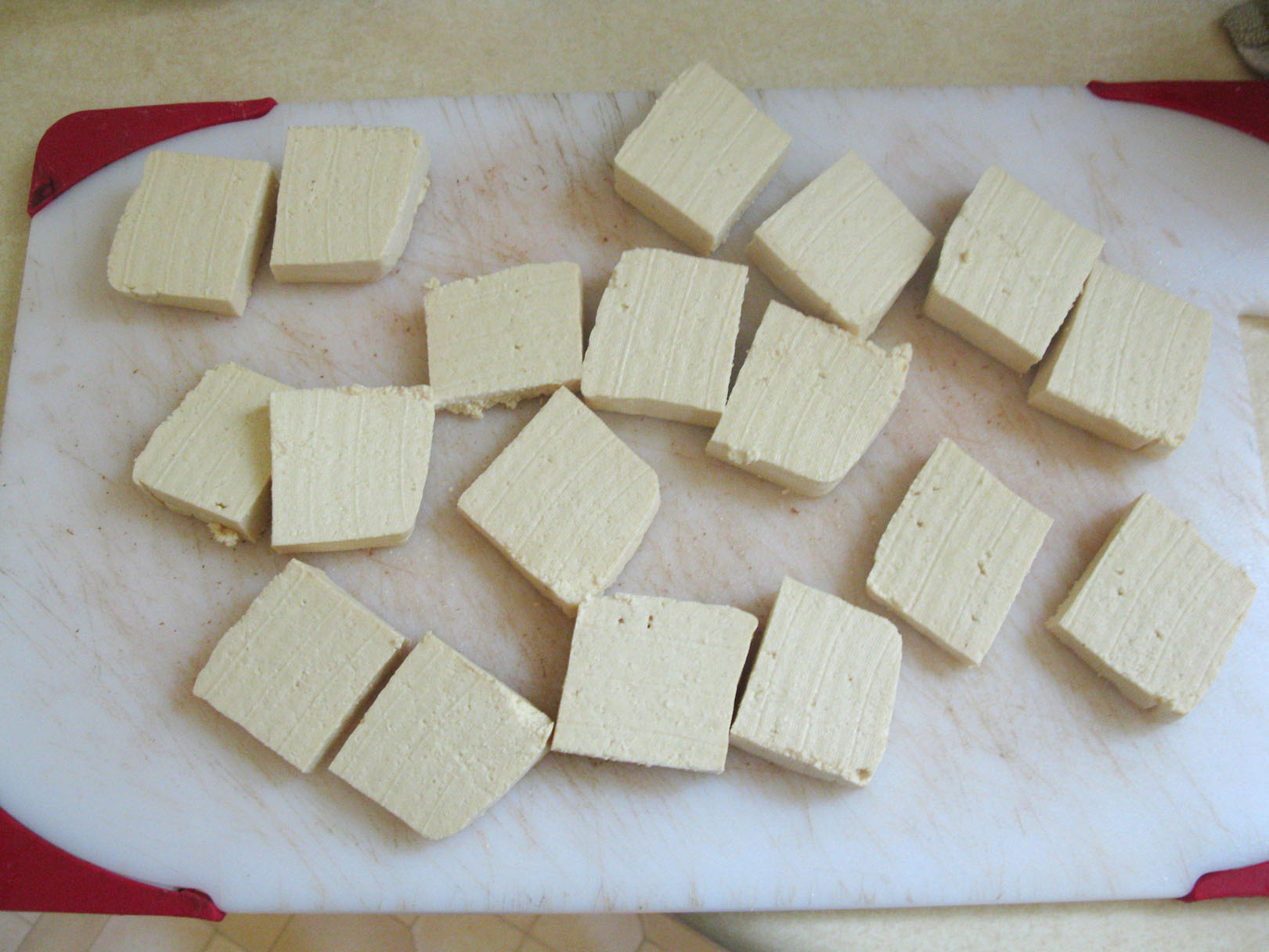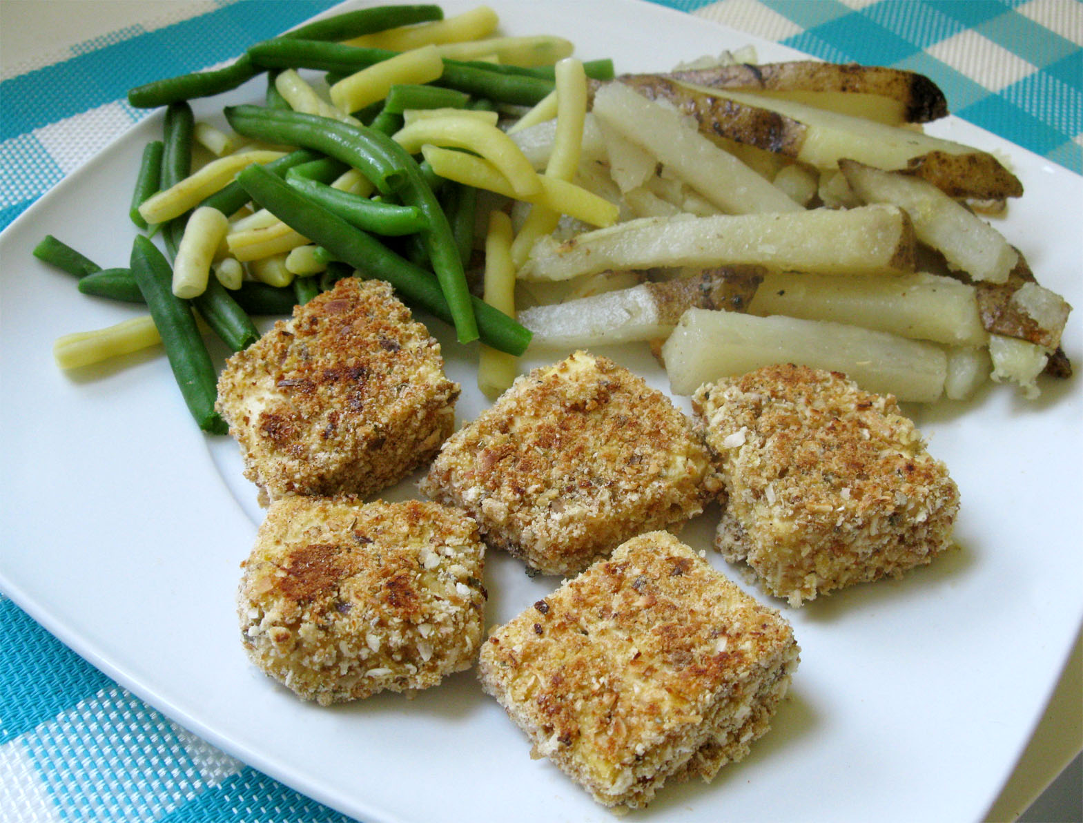 Preheat the oven to 400°F. Cut the pressed tofu width-wise into 12 equal strips, then cut the strips in half to make 24 nuggets.
