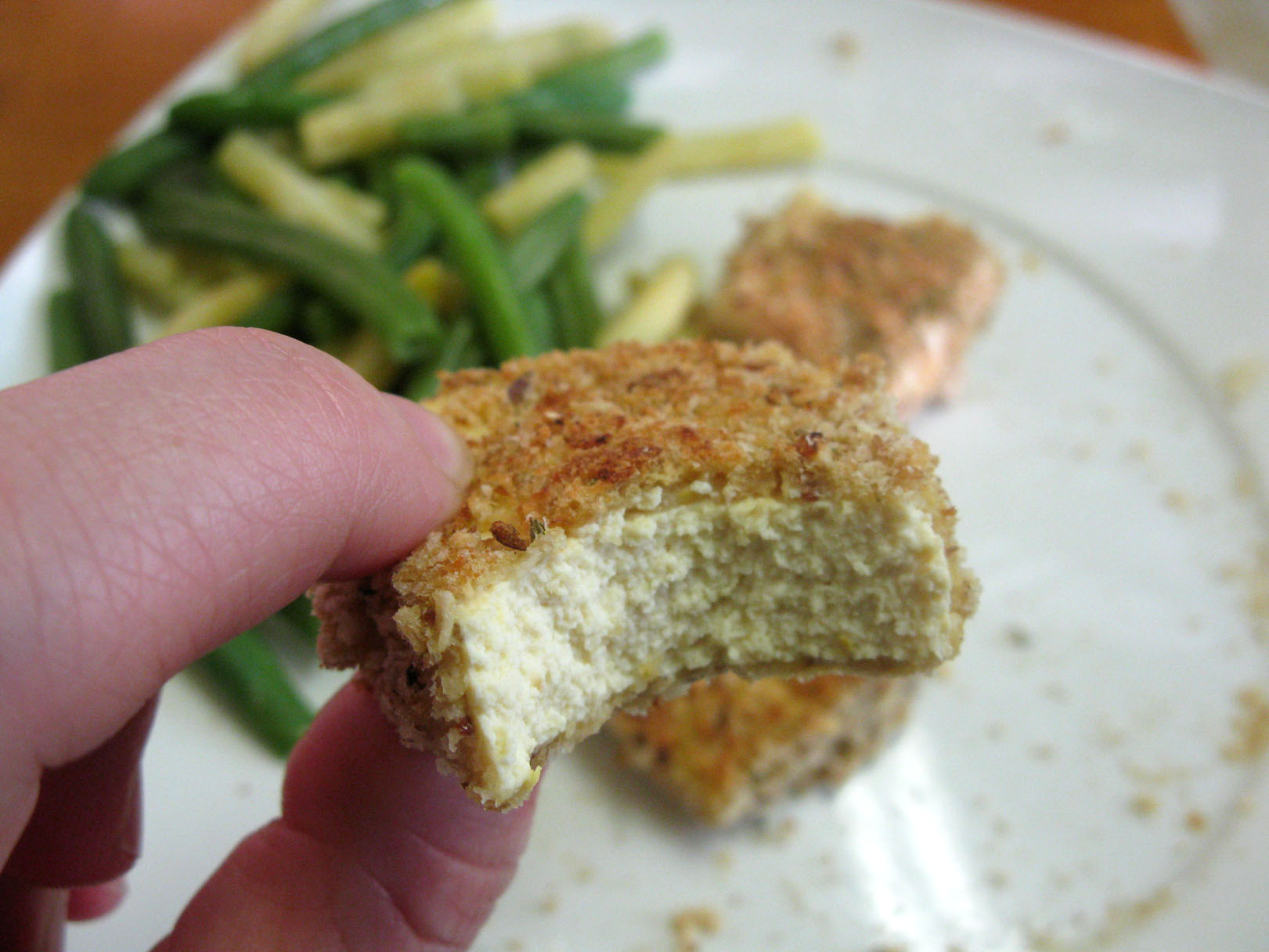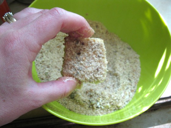 Then press each nugget into the bread crumb/spice mixture and coat on each side. Continue to flip and press the nugget until it is entirely coated with the bread crumb mixture.