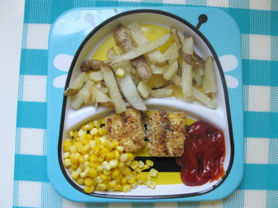 I also served these nuggets and fries with a side of vegetables. I like to make two different types of vegetables at dinner and then have the girls choose what they want. Last night we had corn and green and yellow beans.