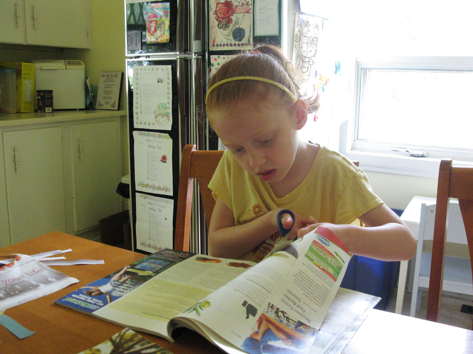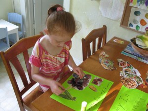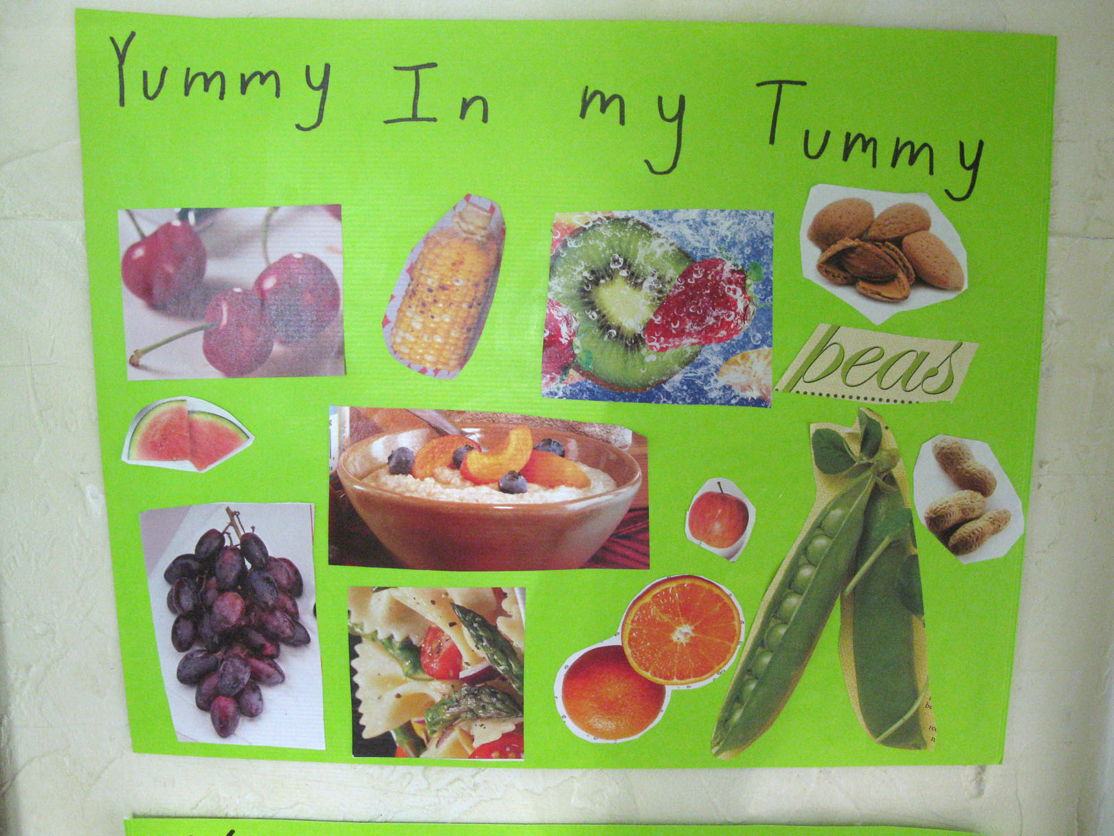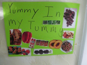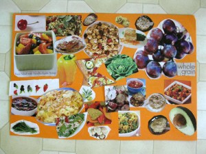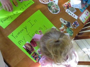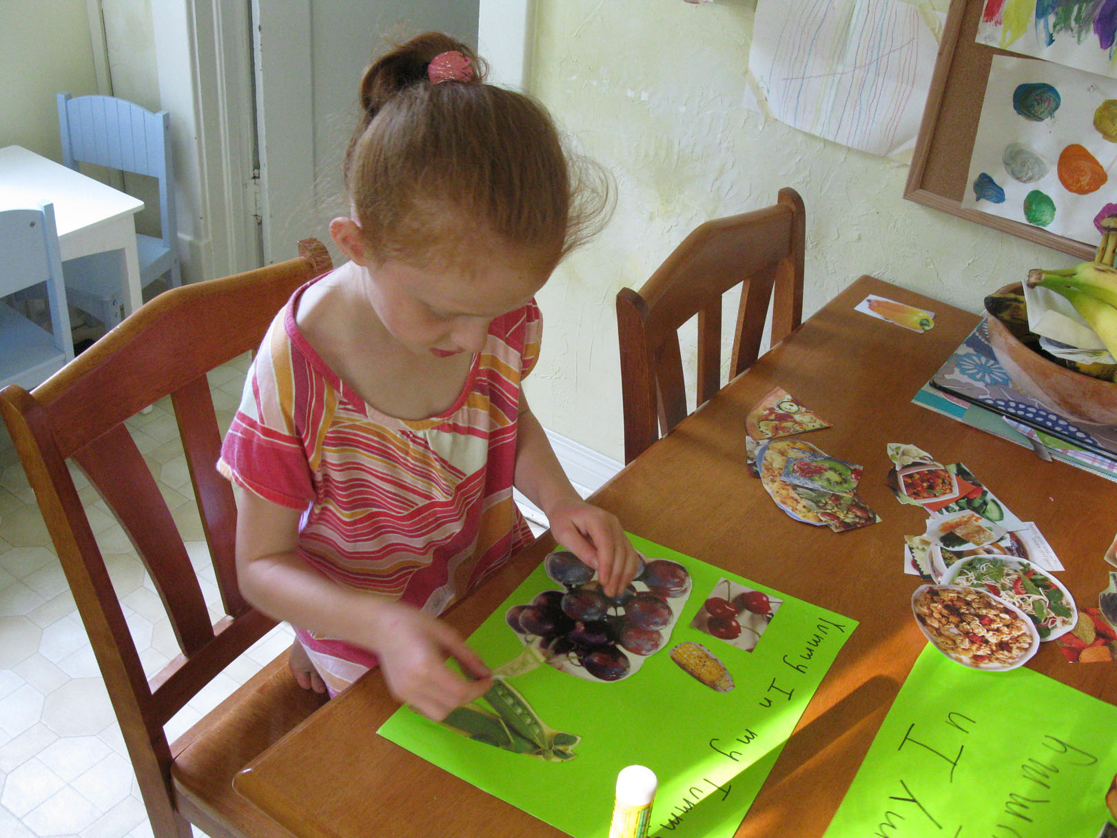 I got out the vegetarian times and alive magazines that I had purchased second hand for 10 cents and got them to cut out pictures of healthy foods that are yummy in their tummies!