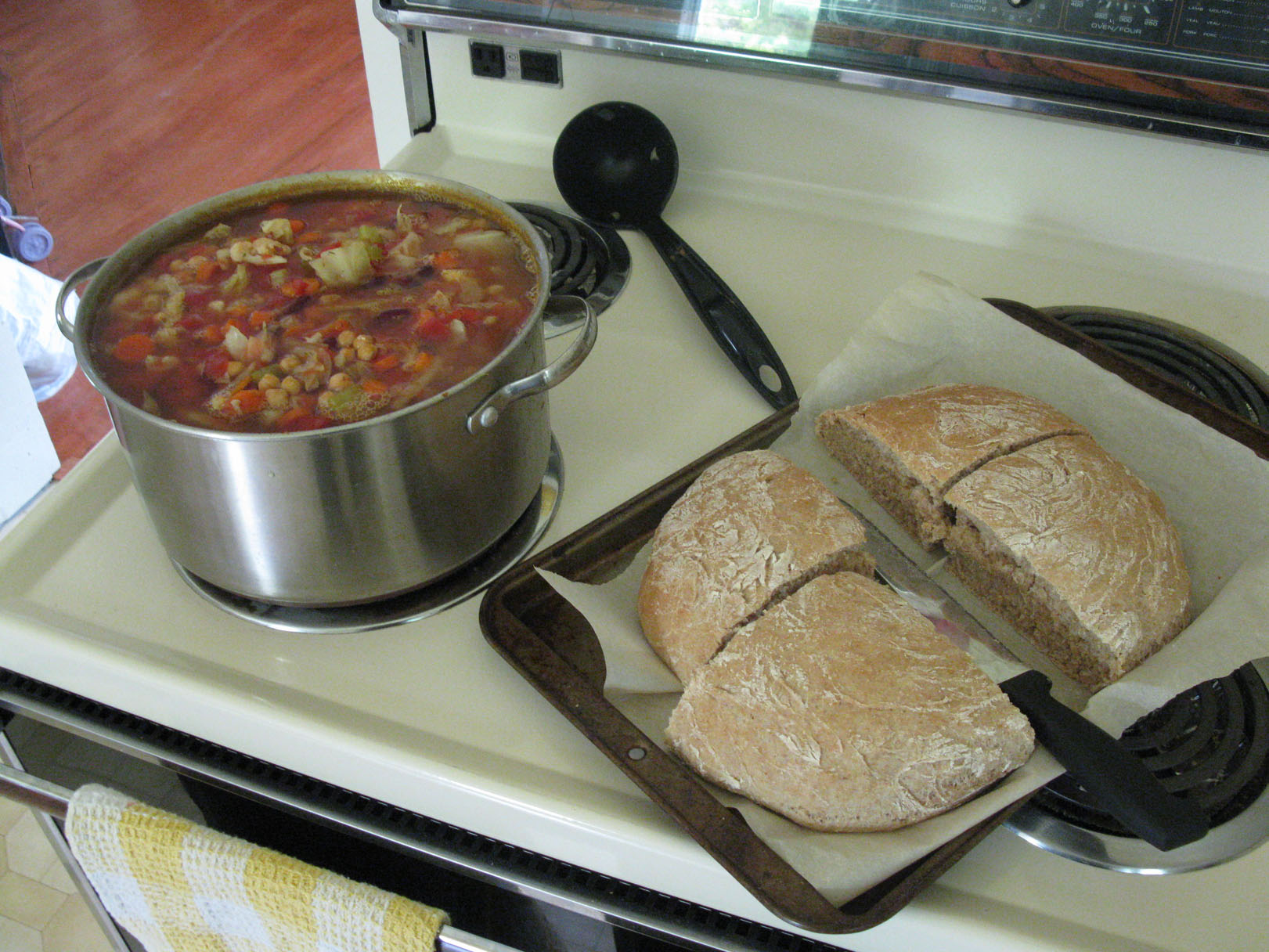 Of course when I made the soup, I had to make whole wheat bread to go with it because there is nothing better than warm fresh baked bread spread with margarine to go with a beautiful vegetable soup.