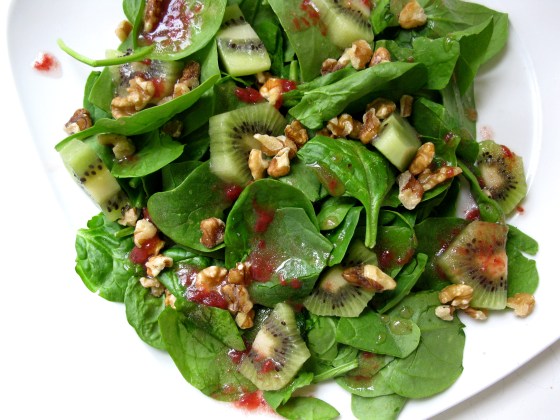 Since I have a real sweet tooth, when I was thinking up what kind of salad to make today I had to go with something fruity. This salad is a spinach salad made with diced kiwi and a Strawberry Vinaigrette. I added walnuts for protein and healthy fat. It was delicious and just what I needed to replenish me after my morning power yoga.