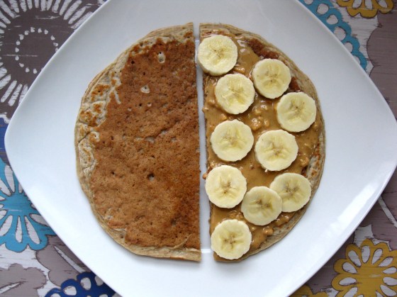 Cut the pancake in half, spread the peanut butter over one half and top with sliced banana.