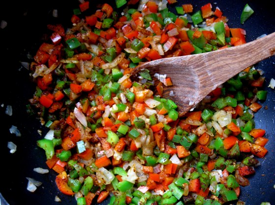 Preheat oven to 350°F. Heat a large skillet or wok on medium-high heat. Add the sunflower oil. Add the diced onion, peppers, garlic, chili powder and lime juice and saute 5-8 minutes, until soft.