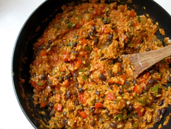 Next, add the nutritional yeast and salsa. Finally, add the cooked brown rice and black beans and continue to cook 3-5 minutes more, until mixture is hot.