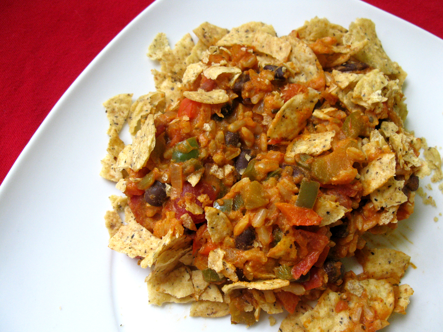 The other night I was researching how to make a casserole because I have never actually made one before and wanted to have a good casserole recipe to add to my repertoire. I wanted to make some kind of casserole with brown rice and black beans since we like the combo. I also knew that I wanted to sprinkle tortilla chips on top of my casserole because I remember having that when I was brought a meal from a friend after Kesara was born. Thus, a perfectly, spicy, cheesy, flavor-loaded, addictive taco casserole was born.