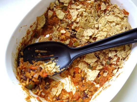 Top with the crushed tortilla chips and bake for 25-30 minutes.