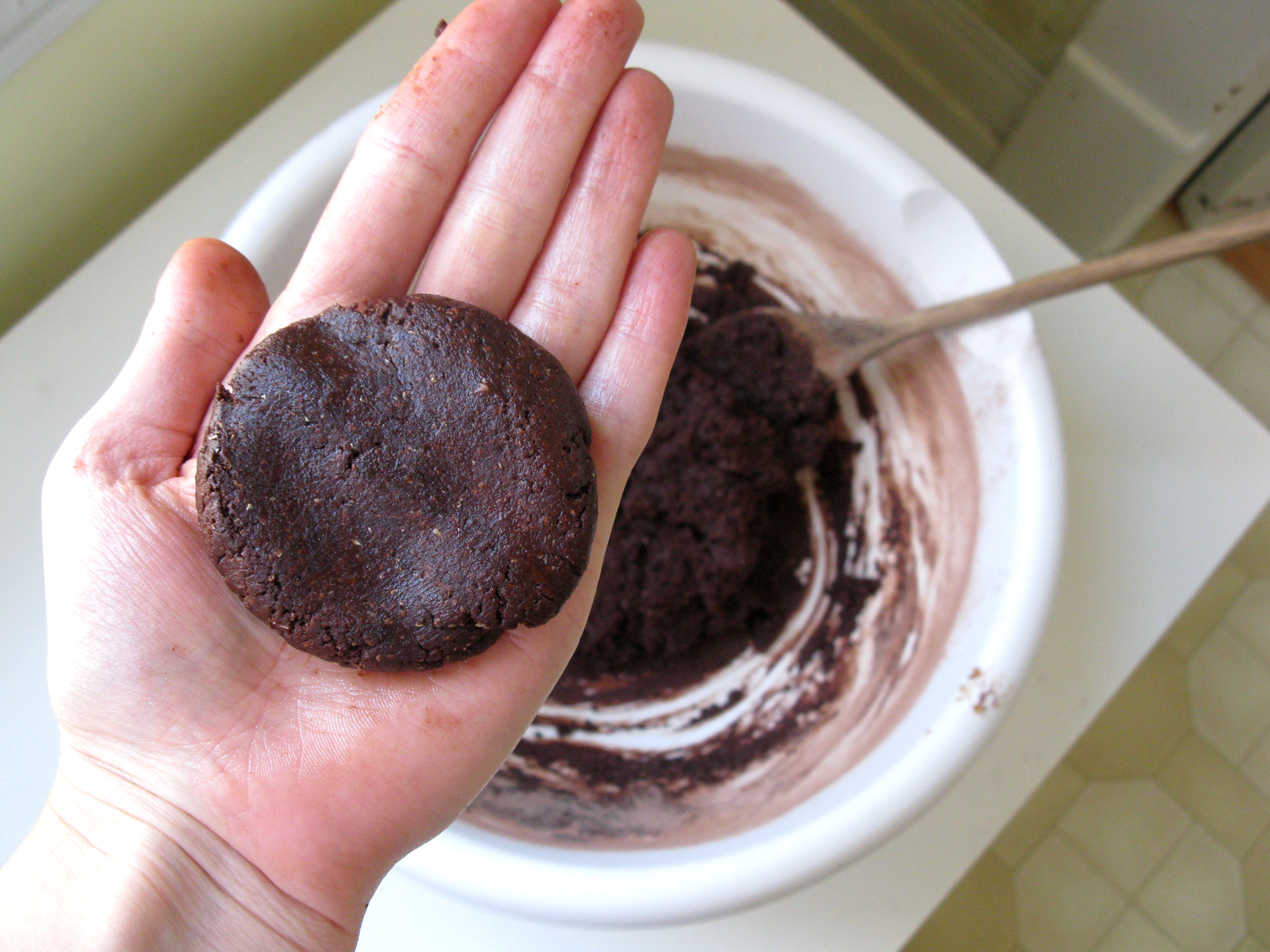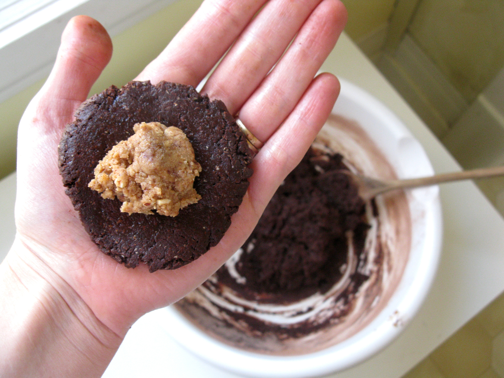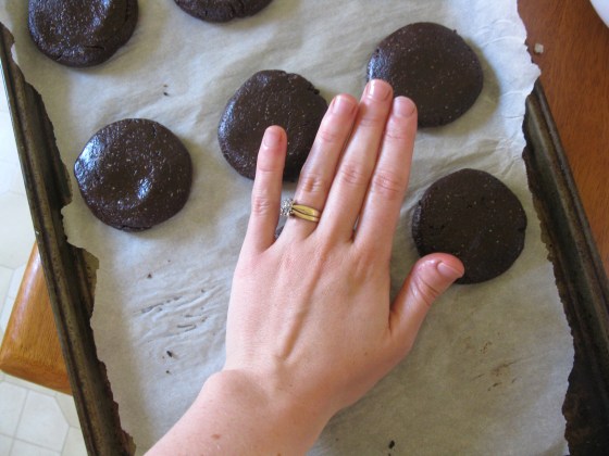 Take a chocolate cookie dough ball and flatten it down in the palm of your hand.