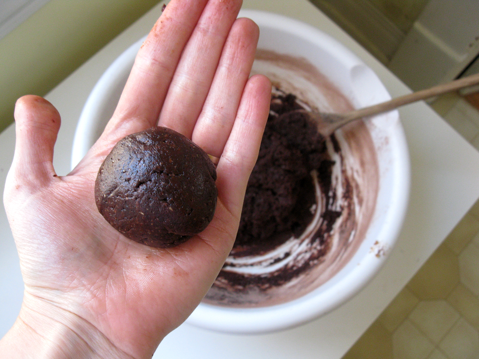Fold the chocolate dough over the almond butter dough and roll into a smooth ball, covering the almond butter dough completely.