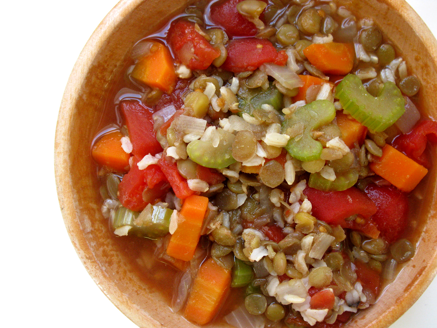 Bring 7 cups of water to boil in a large soup pot. Add the lentils, reduce heat to med-high, cover and boil for 15 minutes. Add the diced onion, carrot and celery along with the remaining 3 cups of water, diced tomatoes and vegetable bouillon powder. Return to a boil and cook another 15 minutes, until the vegetables are fork tender. Finally add the cooked brown rice. Return to a boil, reduce heat and simmer 5 minutes more.