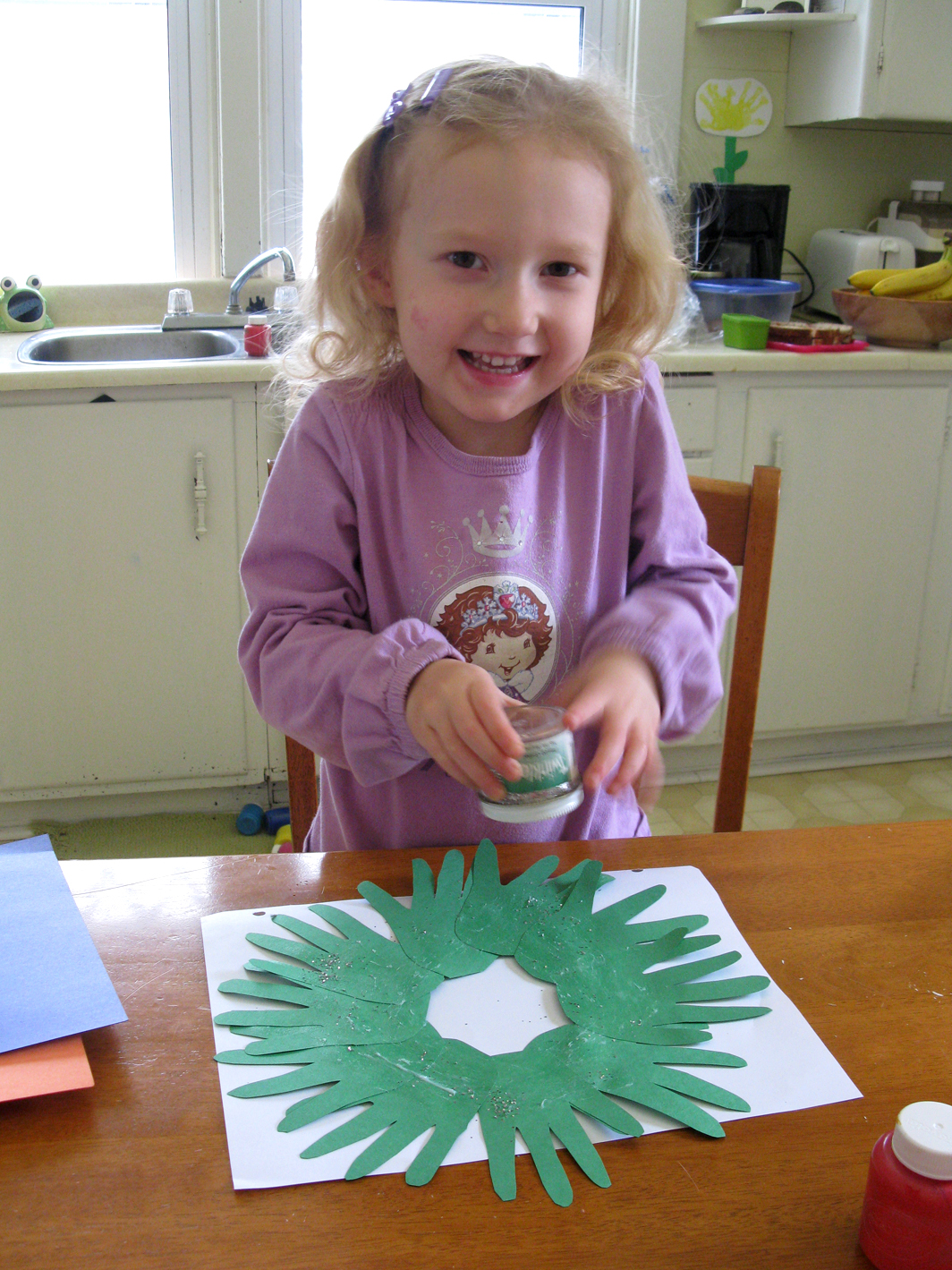 Trace your child’s hand 10 times on the green construction paper and cut out each handprint. Draw a bow on the red construction paper and cut it out as well. Glue the 10 handprints together in the shape of a wreath. Add glue all around the front of the wreath and sprinkle the glitter on top. Finally, glue on the red bow.