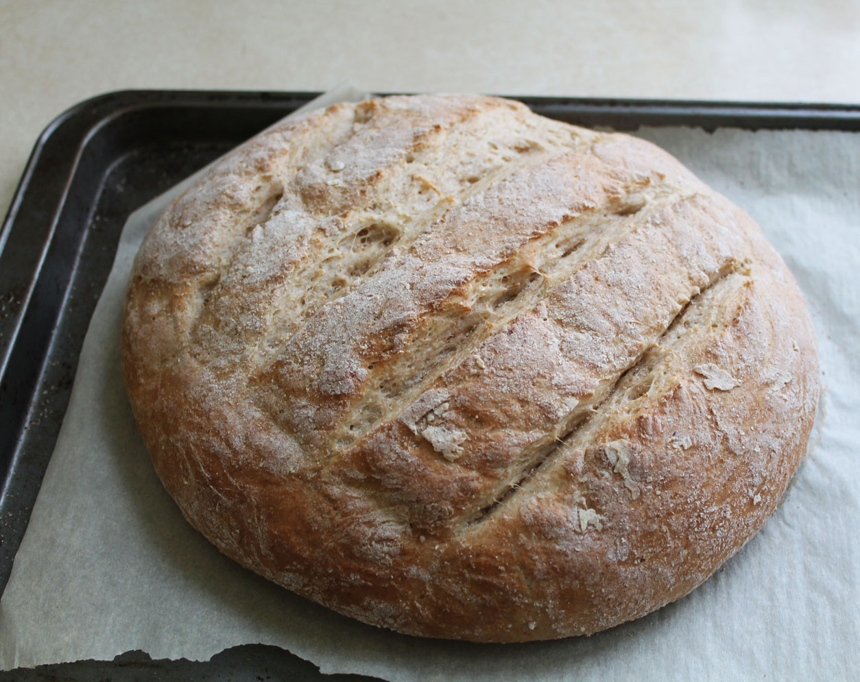 3. Place the dough onto a baking sheet lined with parchment paper and form into either a round or rectangular loaf shape. Slice the top of the loaf diagonally with a knife to add a design if you wish. Cover and allow to rise for 20-30 minutes.