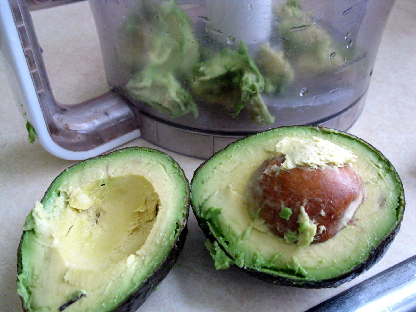 Cut the avocados in half and remove the pits. Spoon the flesh of the avocados into a food processor.