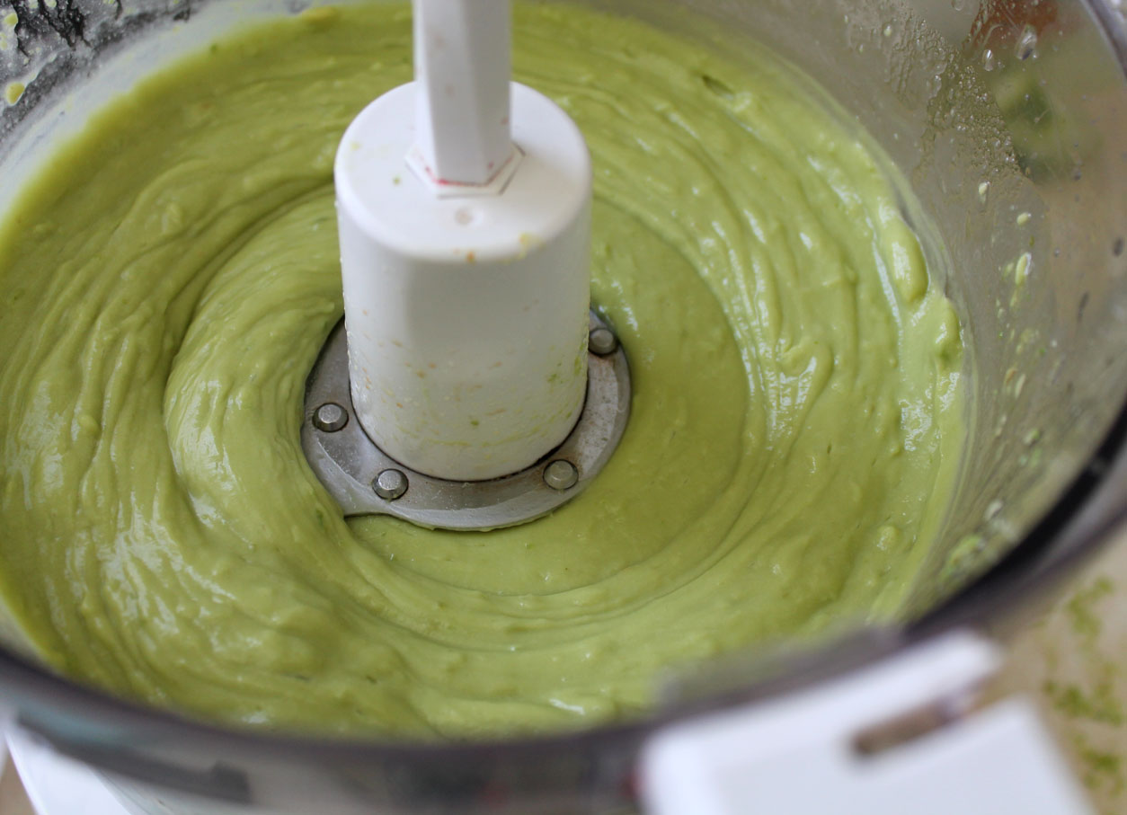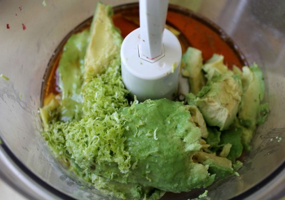 Cut the avocados in half, remove the pits and place the flesh of the avocados into the food processor. Add the lime juice, lime zest, maple syrup and vanilla and process on high until smooth.