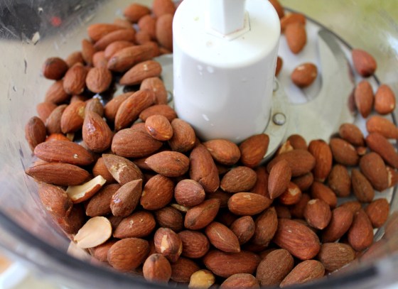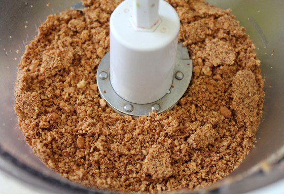 Prepare the crust by placing the almonds in the (washed) food processor and blend until coarsely ground.