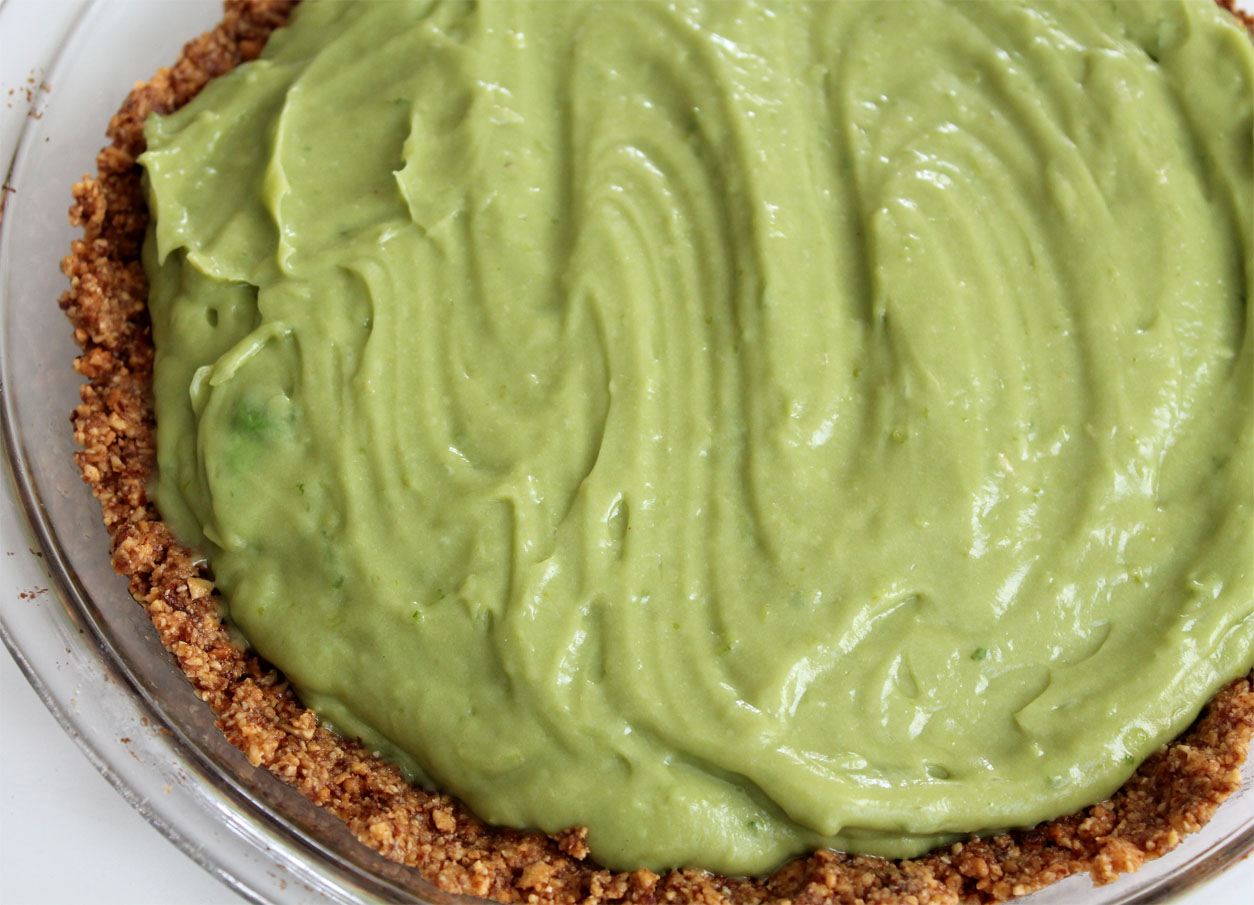Pour the avocado lime filling onto the prepared almond crust, spreading evenly with a spatula. Place the pie into the freezer to chill for 30-40 minutes.