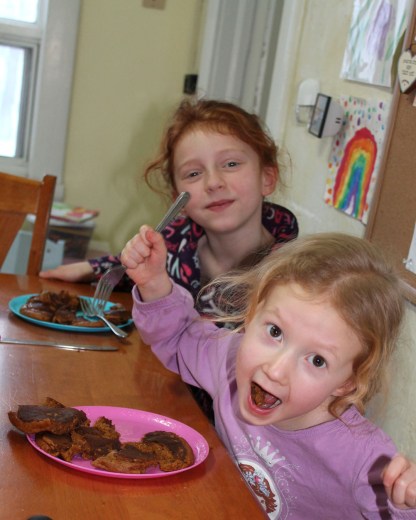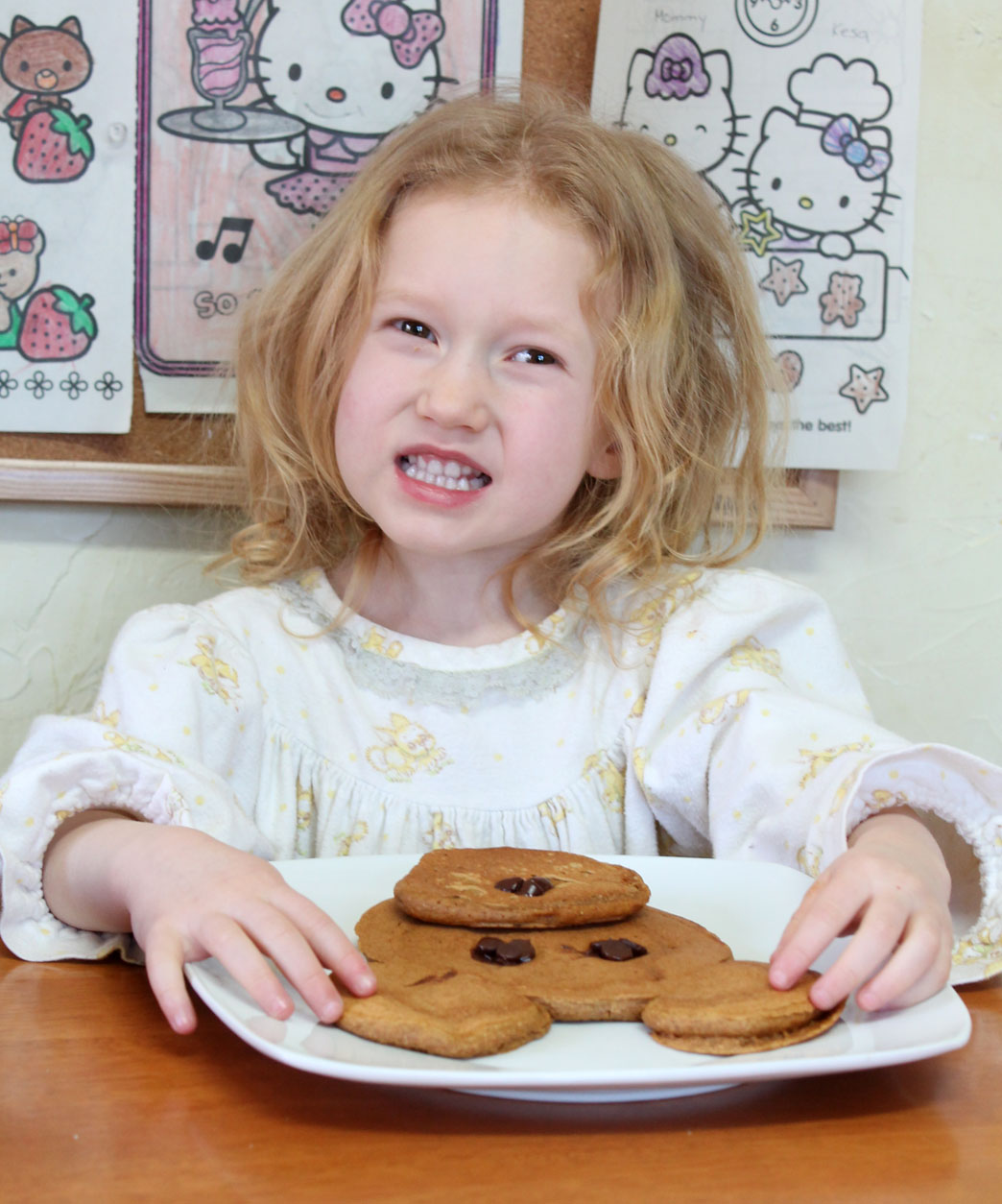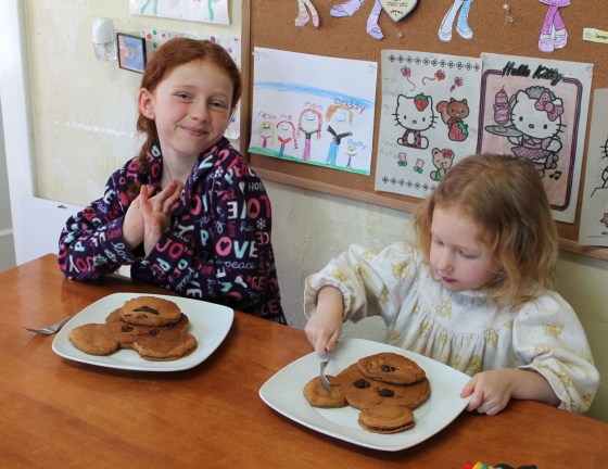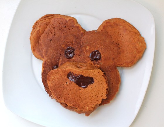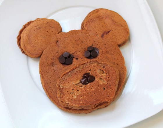 The chocolate chips melt when you put them in the warm pancake so then I just spread them around with my finger to make a larger nose and eyes. Then they looked more like bears. 🙂