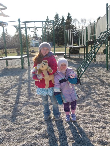 After the walk I sometimes take the girls to the park too. When we go all the stuffies have to come too.
