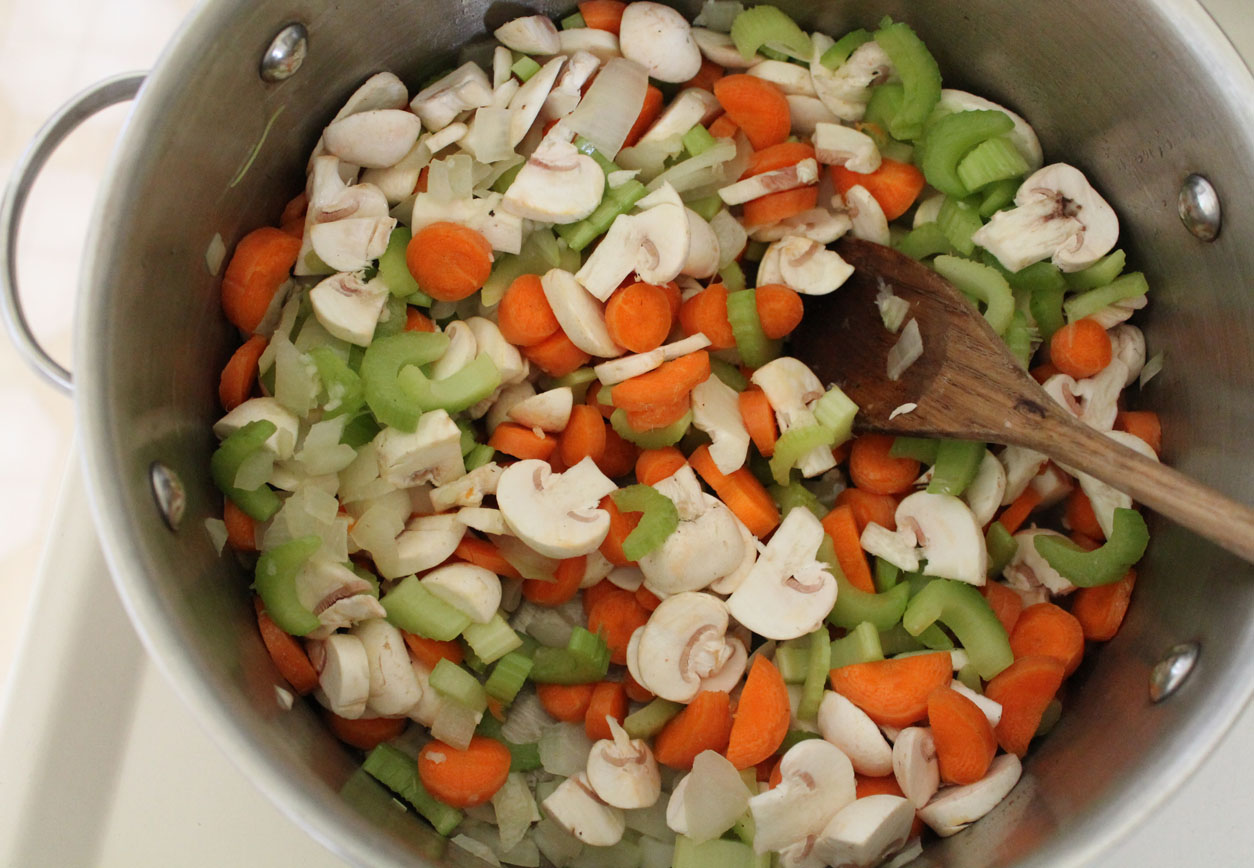Heat the sunflower oil in a large pot on medium heat. Add the diced onion and pressed garlic and saute 3-5 minutes until fragrant and onions are translucent. Add the carrots, celery and mushrooms and continue to cook 10-12 minutes more, until the vegetables have softened a bit. I like to add a bit of water to the pot along with the vegetables to help them cook, about 1/4 cup or so.