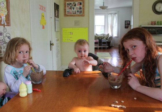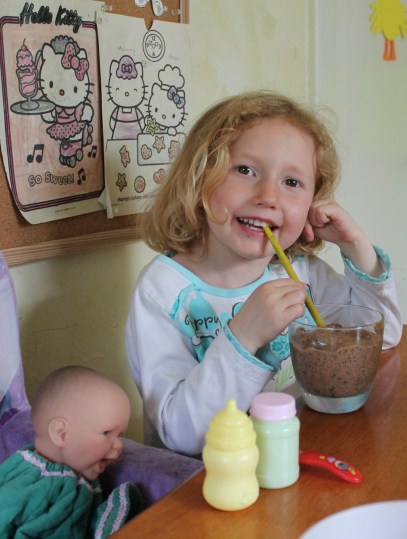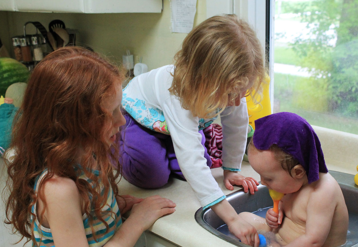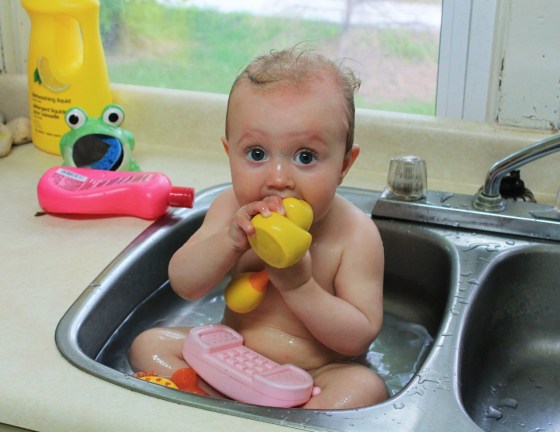 After Serafina devoured the smoothie, cheerios and a bunch of cookies, it was time for a bath in the sink!
