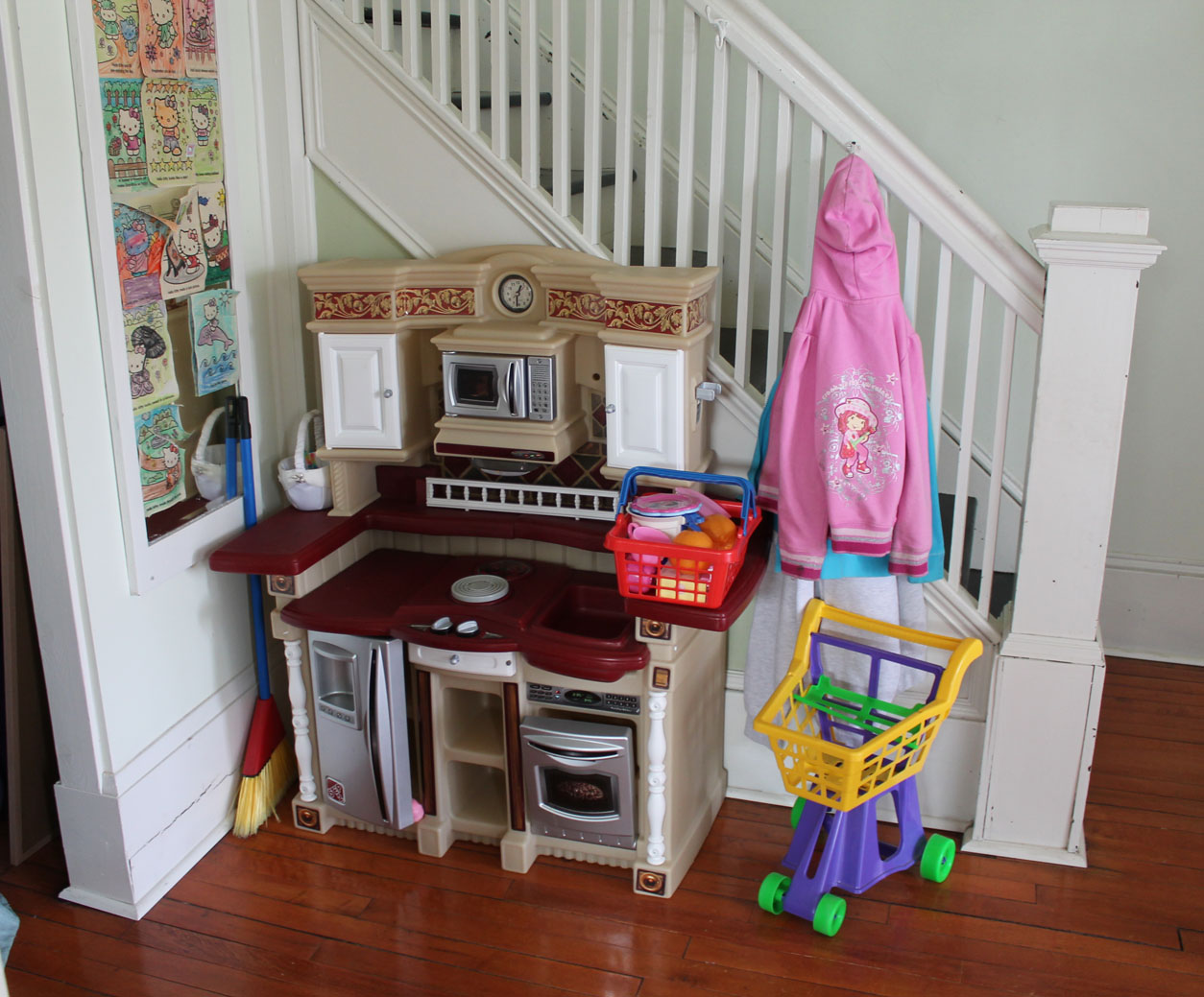 I moved their little play kitchen by the staircase and could hide their toy box under the stairway.