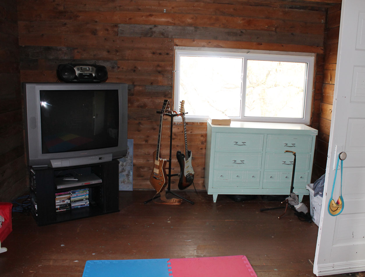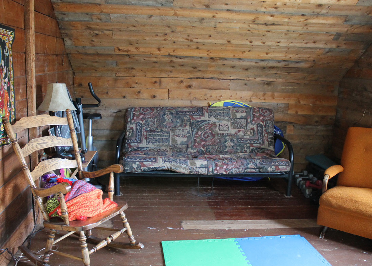 Where we do yoga and keep yet another T.V. (there are too many). The room that is an unfinished one, off of the master bedroom. A cozy little space.