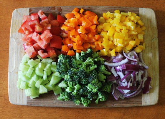 For lunch today I was going to make a soup and bread, but I decided to make something different for a change. Instead of cooking vegetables into a dish, I made a lighter meal, pasta salad with all the different colors of the rainbow! It got the kids excited and grabbing out every kind of vegetable we had in the fridge. I have to admit that all the color had my mouth watering as well.