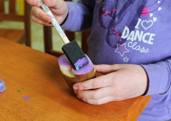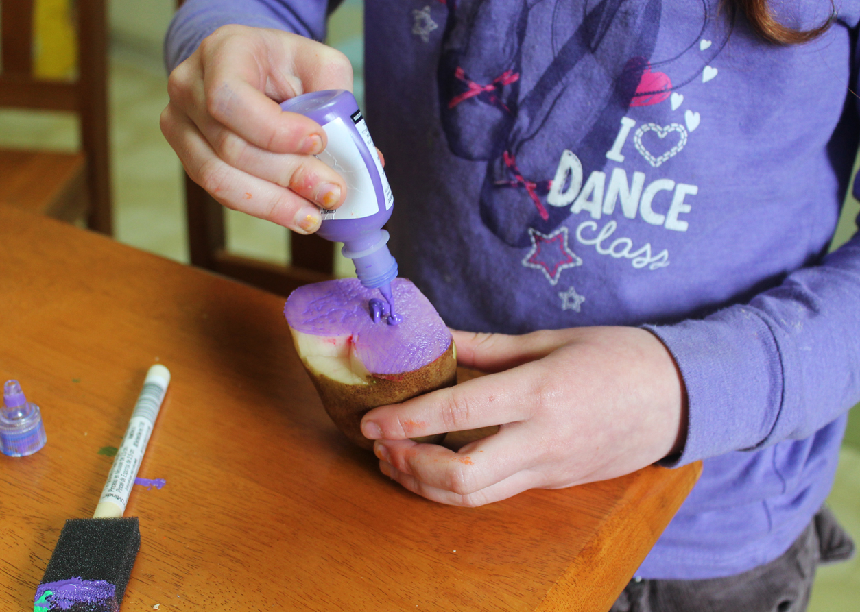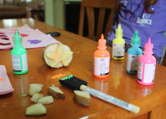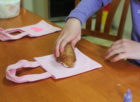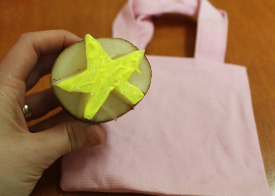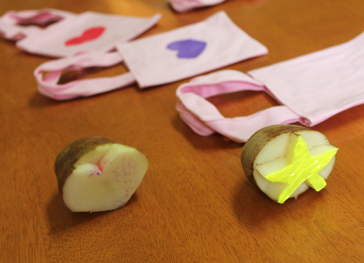 Potato Stamping Posted on June 14, 2012 by Tiffany 1 The same day that we picked up the fabric paint and made the Eat The Rainbow T-Shirts, we also did some potato stamping on some cloth bags. All you need is some fabric paint, some cloth bags or T-shirts, a small brush, potatoes and a sharp knife. Carefully cut out the shapes you want from the potatoes. Brush on some paint. And stamp away! A fun and easy homemade craft idea. Share this: Click to share on Facebook (Opens in new window) Facebook Click to share on X (Opens in new window) X Click to email a link to a friend (Opens in new window) Email Click to share on Tumblr (Opens in new window) Tumblr Click to share on Pinterest (Opens in new window) Pinterest Like Loading... Related