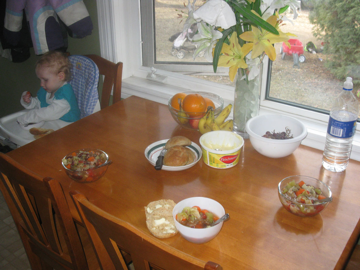 A meal of soup and whole wheat buns. Kesa in her high chair, just a little over one year old.