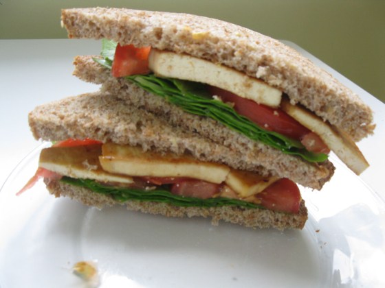 Stacked tofu bacon sandwich, again blurry.