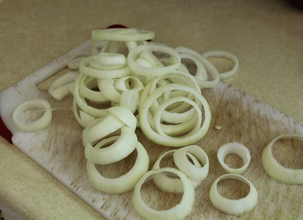 5. Dip each onion ring into the milk/flax mixture and then into the cornmeal breading, flipping to coat. Place each breaded onion ring onto the baking sheet. Repeat with the remaining onion rings.
