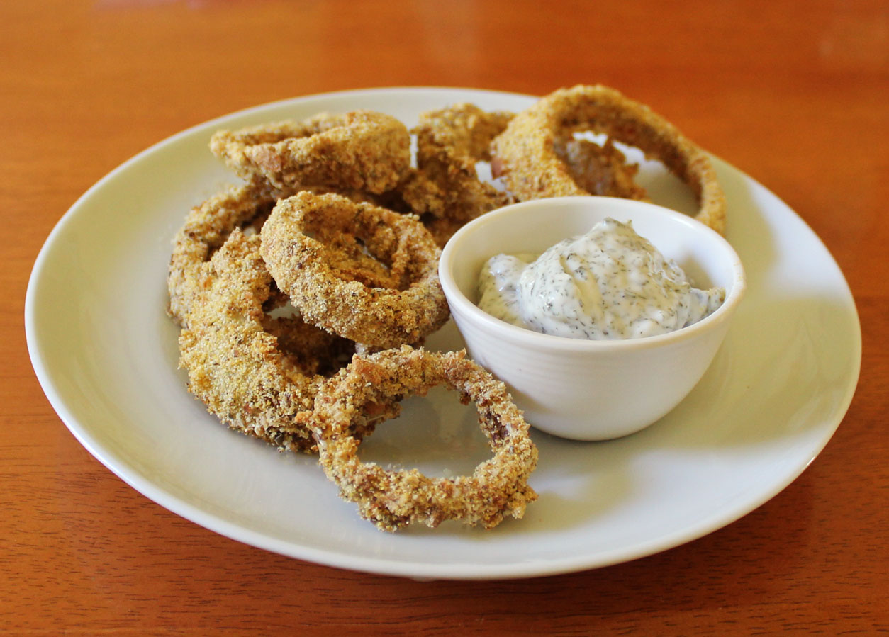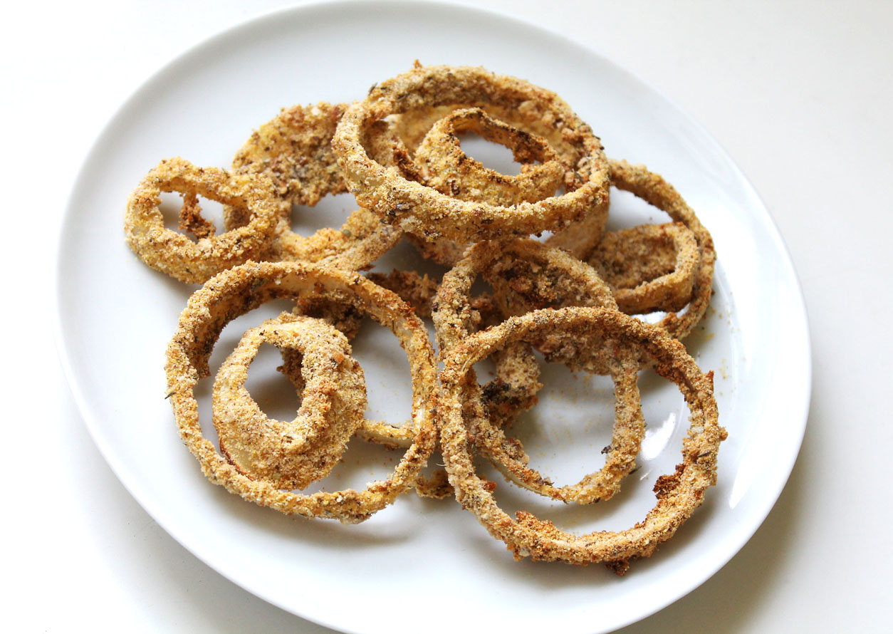 Crispy oven baked onion rings coated in flax, cornmeal and whole wheat bread crumbs and seasoned with garlic, sage and thyme.